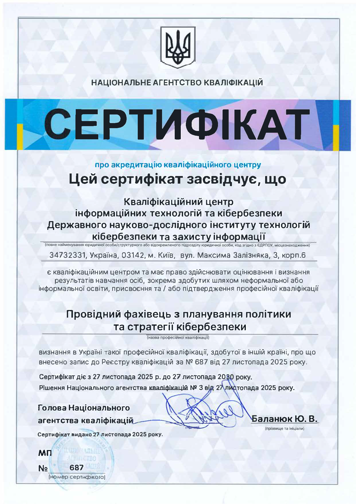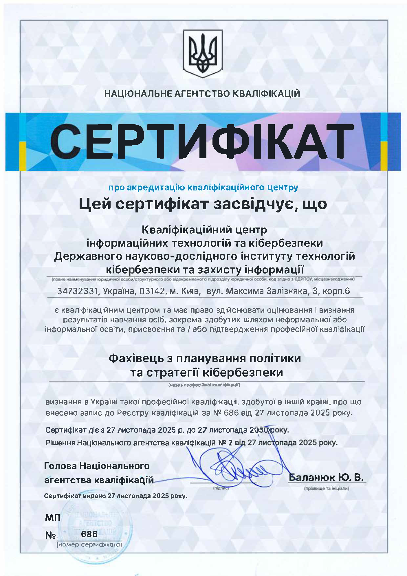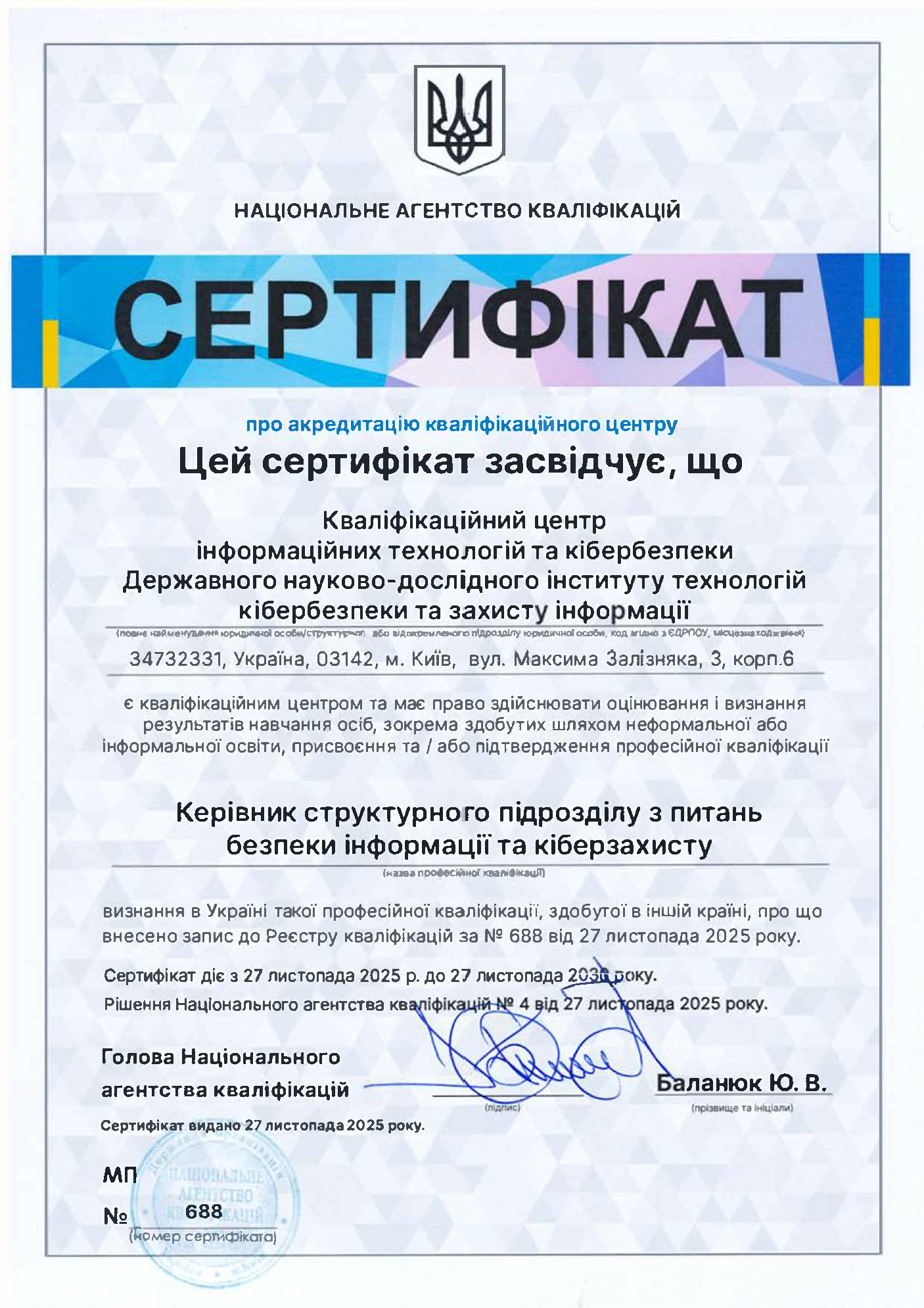 Акредитація центру (сертіфікати №№ 686 - 688 від 10 січня 2025 року, термін дії до 27 листопада 2030 року).